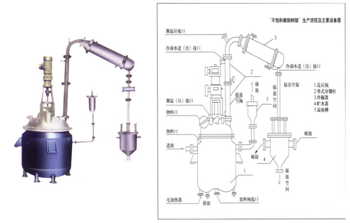 本全套裝置是用于生產(chǎn)不飽和聚脂樹脂、酚醛樹脂、環(huán)氧樹脂、ABS樹脂、油漆的關(guān)鍵設(shè)備。全套設(shè)備由反應(yīng)鍋、豎式分餾柱、臥式冷凝器、貯水器、溢油槽、管線(對稀釜)等組成,全套設(shè)備與物料接觸部分的采用不銹鋼制作。